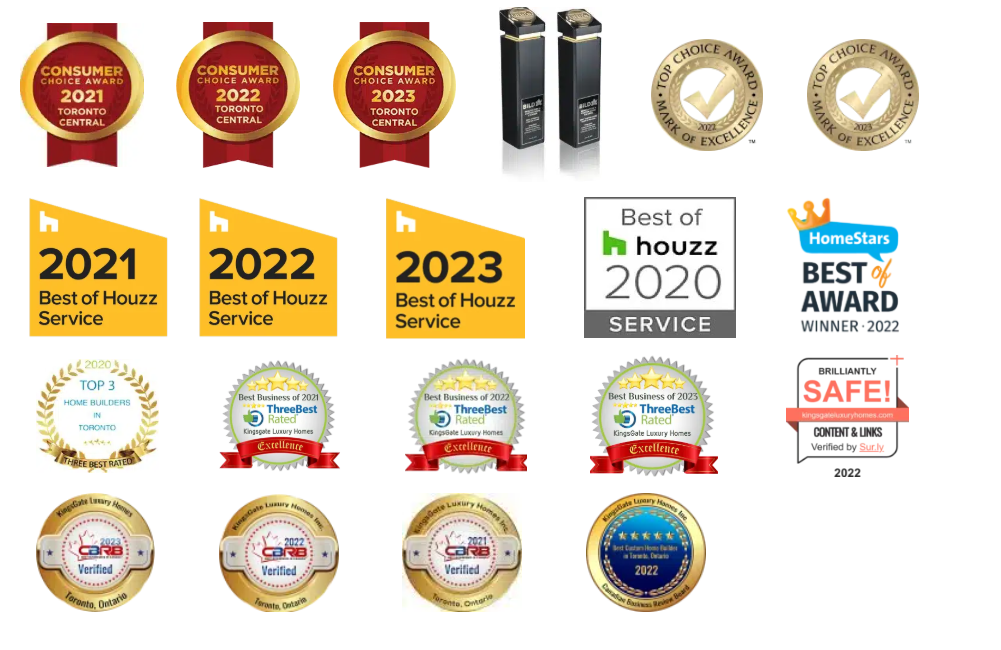 With a string of prestigious awards under our belt, Kingsgate Luxury Homes has consistently demonstrated excellence in custom home building throughout Toronto. Our commitment to quality, innovation, and client satisfaction has been acknowledged with honors such as the Consumer Choice Award for the years 2021, 2022, and 2023, as well as the Top Choice Award for 2022 and 2023. We’ve also proudly claimed the titles of Best Overall Custom Home Winner and Best Custom Home Over 1 million Winner.